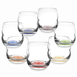 Vitaalwater drinkglazen "Mythos" met chakra affirmaties op de bodem van de glazen. De affirmaties zijn ieder een combinatie van symbool, kleur en woorden. Allemaal met de intentie om iemands kwaliteiten en potentie te herkennen.